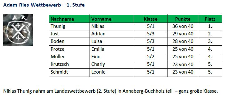 − der Adam-Ries-Wettbewerb (13 Teilnehmer) mit Hausaufgabenrunde und Schulrunde und