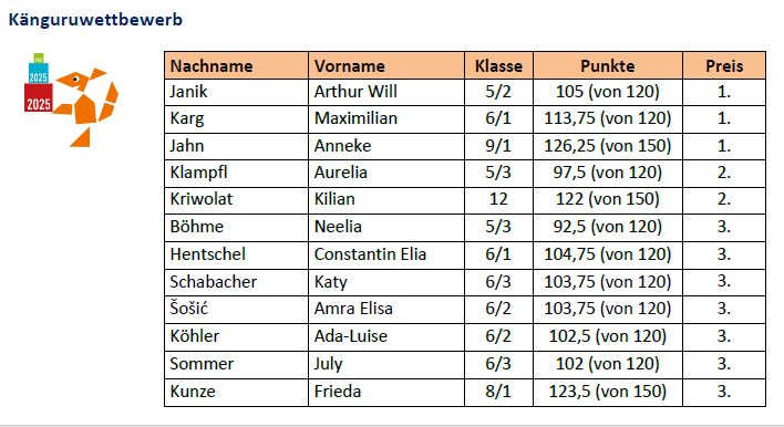 Sowohl die Anzahl der teilnehmenden Schüler*innen als auch die Ergebnisse (siehe untere Tabelle) zeigen, dass die Mathematik an unserem Gymnasium einen hohen Stellenwert einnimmt. Wir sind stolz auf alle erbrachten Leistungen.