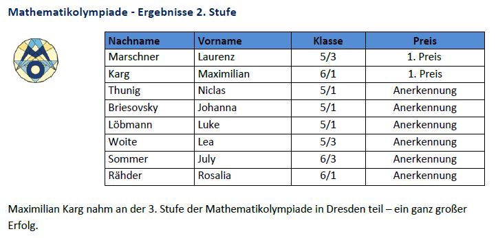 − die Mathematikolympiade mit erster Stufe (60 Teilnehmer) und zweiter Stufe (43 Teilnehmer),