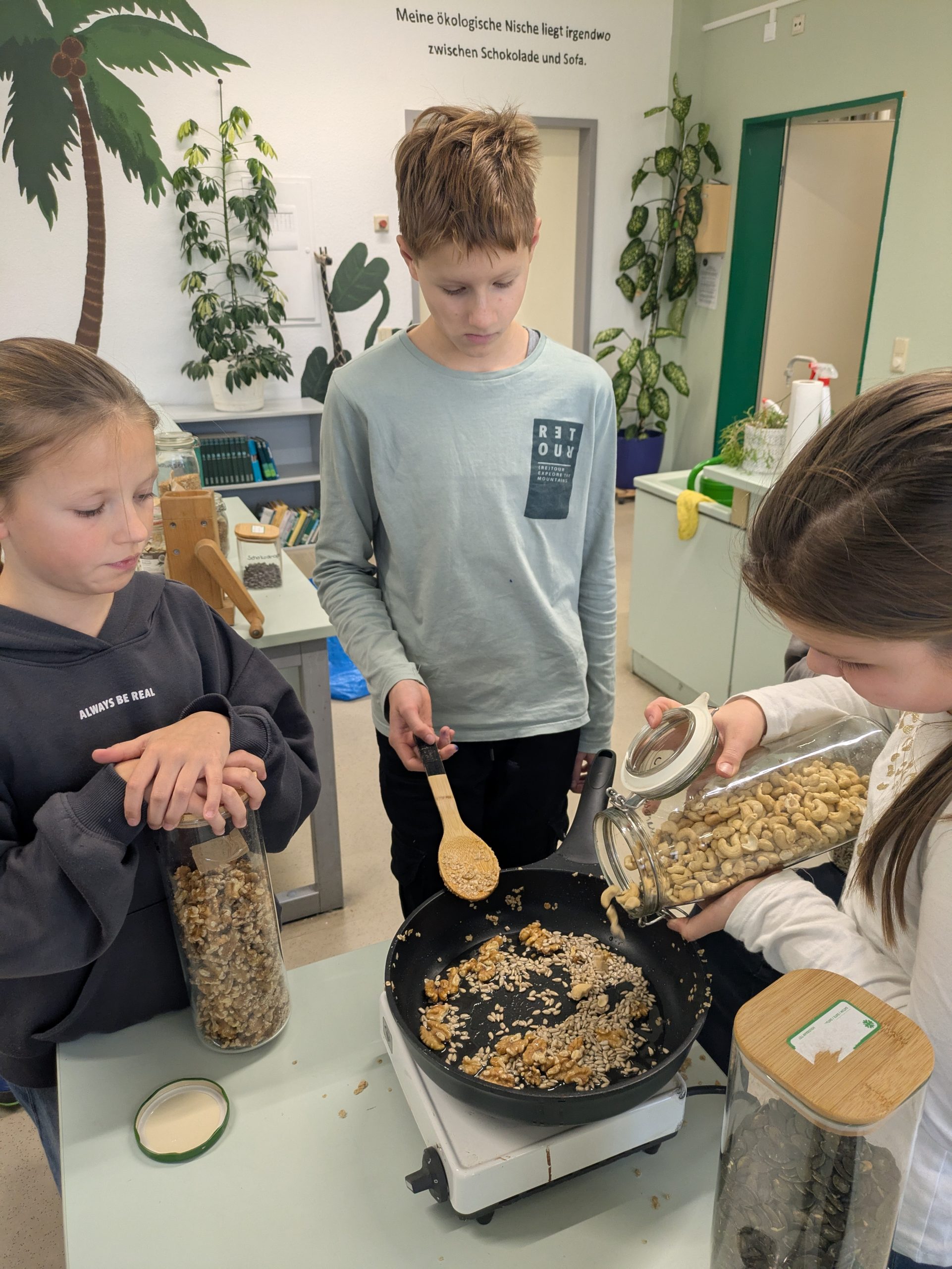 – Müsli selbstgemacht: An einer weiteren Station durften die Kinder kreativ werden und ihr eigenes Müsli zusammenstellen. Verschiedene Nüsse, Haferflocken, Trockenfrüchte und Samen standen zur Auswahl. Besonders spannend war das Rösten der Zutaten in der Pfanne – ein Highlight, das nicht nur köstlich duftete, sondern auch viele Kinder zum Nachahmen animierte.